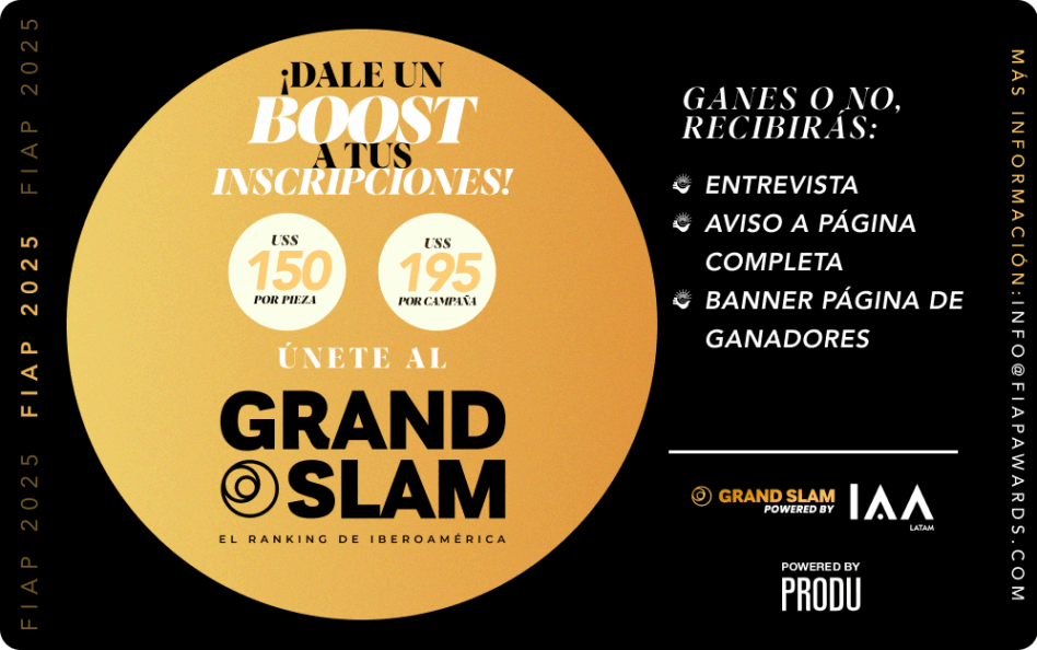 Por tercer año consecutivo, el Festival Iberoamericano de la Creatividad (FIAP) abre un espacio de visibilidad extra para las piezas inscritas: Boost, una herramienta que permite a las campañas participantes ganar exposición adicional a través de la revista digital del Grand Slam, distribuida durante Advertising Week Latam 2025, uno de los eventos más influyentes del sector en la región. Este espacio incluye una reseña de la pieza contada por el propio equipo creativo, aportando contexto, visión y detalles relevantes del proceso detrás de la idea.