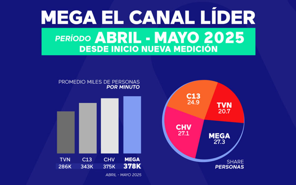 Cumplidos dos meses desde la puesta en marcha del nuevo modelo de medición de rating, Mega sigue siendo el canal más visto por los chilenos y chilenas, considerando el período abril y mayo 2025. Desde el 1 de abril hasta el 31 de mayo 2025, Mega promedió 377.759 personas por minuto. En ese mismo...