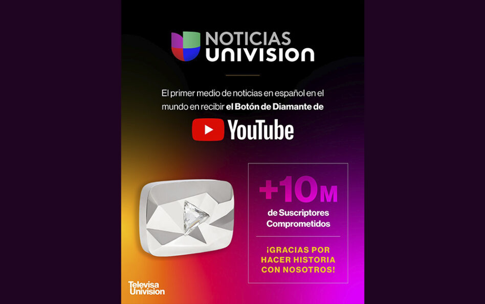 La división informativa, Noticias Univisión, de TelevisaUnivision, ha recibido el YouTube’s Diamond Play Button, uno de los mayores honores de la plataforma, tras superar los 10 millones de suscriptores en su canal.