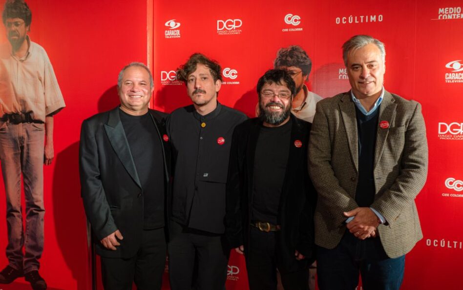 Manuel Ruiz, Simón Mesa Soto, Ubeimar Restrepo; productor, director y protagonista de Un poeta, y Alejandro Bernal, gerente de Cine en Caracol Televisión