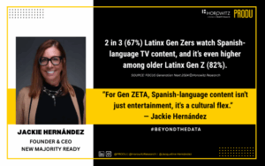At Horowitz Research, our mission is to deliver deep insights into how diverse audiences engage with media content and technology. For example, 2 in 3 (67%) Latinx Gen Z viewers watch Spanish-language TV content, and that number is even higher (82%) among older (ages 18-27) Latinx Gen Z, according to our recent study State of Media, Entertainment, and Tech: Focus Generation Next.